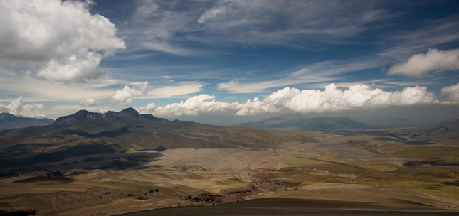 Vlevo na horizontu je sopka Rumiňahui, která dostala jméno po inckém generálovi, který se stal po smrti Inky Atahualpy vůdčí osobností ozbrojeného odporu Inků vůči Španělům. Vlastní jméno je složenou ze dvou jmen: Rumi znamená skála a ňawi znamená…