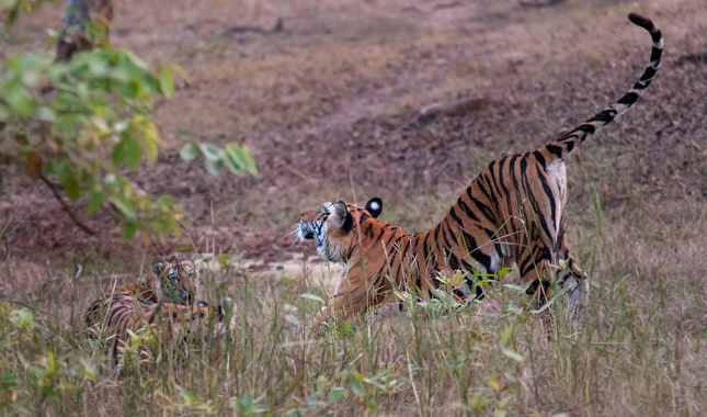 Ráno jsme objevili tygří rodinku o potoka, kde společně hasili žízeň. Po důkladném načerpání tekutiny si matka protahovala tělo a tygří mláďata odpočívala.