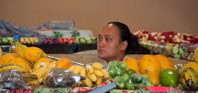 Na malém, čistém a téměř prázdném trhu v městečku Uturoa se nabízelo především ovoce, ryby a suvenýry.