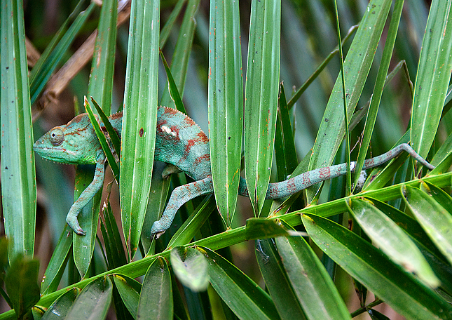 Tentokrát jsme uviděli chameleona ve dne, při procházce Malými Tsingami. Byl překvapivě pohyblivý a neustále se schovával za listy.