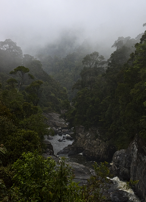 Další obrázek pralesa částečně schovaného v dešťových mracích a mlze.