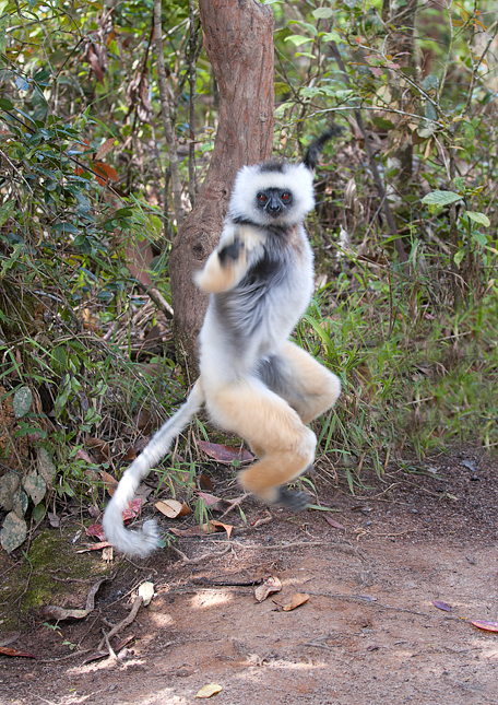 Sifaka velký, podobně jako jeho ostatní druhy rodu Propithecus, jsou pověstní svými boční skokovými přesuny. Náš průvodce samozřejmě lákal lemura na pamlsek a tak jsem měl možnost se na skoky lemura alespoň teoreticky připravit. Překvapivá rychlost lemura a krátká vzdálenost ale přece jen fotku poznamenaly.