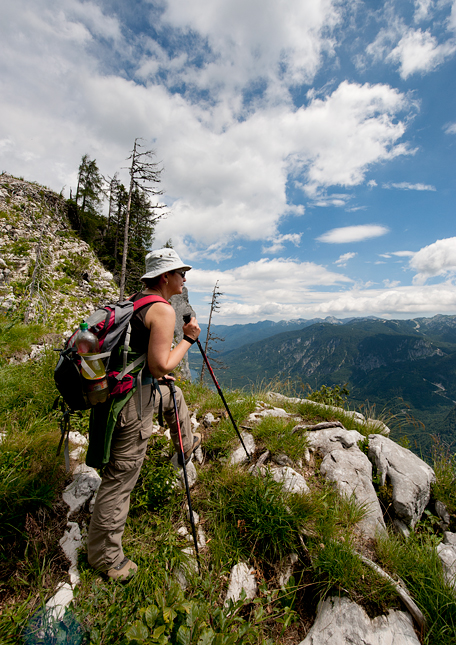 Po příkrém výstupu na Černé jezero (1457 m n.m.) jsme čekali, že nás už bude čekat jen a jen pozvolné klesání. Zpáteční cesta k autobusové zastávce nás však už kousek za jezerem vedla stále vzhůru. Stoupání zde však už zdaleka nebylo tak strmé jako k jezeru. Téměř v nejvyšším bodu (něco přes 1500 m n.m.) naší trasy se ve dvou místech otevřel výhled na jezero Bohinj a protější svahy Julských Alp.