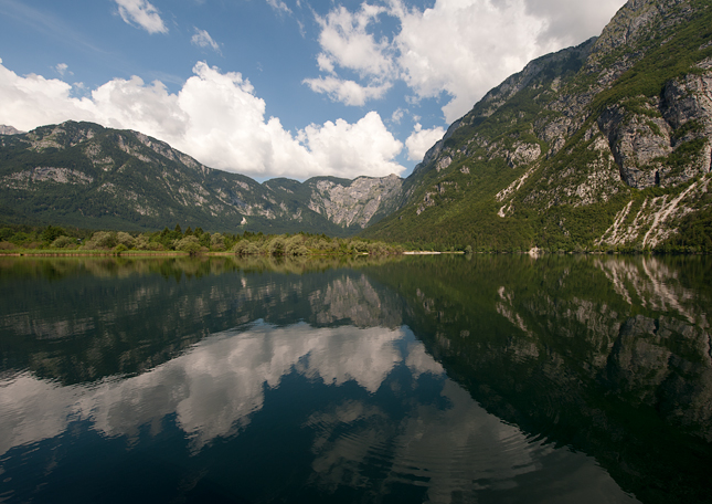 Poslední den jsme si dopřáli vyhlídkovou jízdu po jezeře Bohinj. Na obrázku je zrcadlení krajiny v západní části jezera.