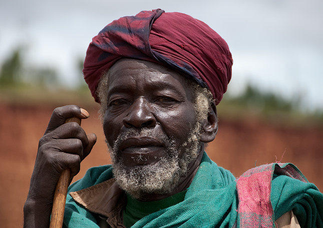 Focení ve vesnici Gesergio, které je " Konzo - New York" bylo asi nejnáročnější z celé jižní Etiopie. Roj dětí nás obklopil naše auto hned za odbočkou do vesnice a pobíhal kolem auta bez ohledu na okřikování řidiče. Jakmile jsme vystoupili z auta obestoupil nás dav snad padesáti dětí a všechny pokřikovaly:" foto,foto a občas taky many, many. Museli jsme požádat o takový improvizovaný azyl v místní škole a tady jsme udělali pár fotek. Tento krok děti trochu zklidnil a tak jsme potom mohli projít vesnicí k propadlině s pitoreskními pískovcovými stěnami, kde jsme nafotili tohoto staršího muže.