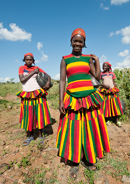 Tři dívky z kmene Konzo v typické dvojité sukni v oblíbených národních barvách.