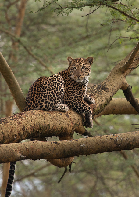 Krátce po vjezdu do národního parku jsme narazili na tento parádní kousek levharta. Byl poměrně blízko od cesty a navíc jsme u něj byli první, takže jsme si mohli vybrat nejlepší pozici. Světla však po ránu moc nebylo, takže jsme zkoušeli fotit s bleskem. Naštěstí jsme po chvíli blesk vypnuli. Všechny fotky s bleskem totiž byly s těžko opravitelnýma červenýma očima. Levhart naštěstí měnil polohu jen občas, takže i se slabým světlem fotky celkem vyšly. Určitě jsou to naše nejlepší záběry levharta vůbec.