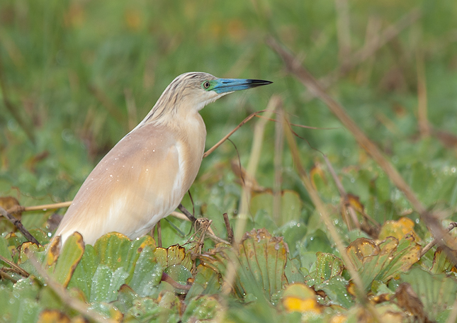 V období páření. Volavka se po ránu brodila mělkou vodou a krůpěje rosy z okolních rostlin zůstávaly na jejím "svatebním hávu".
