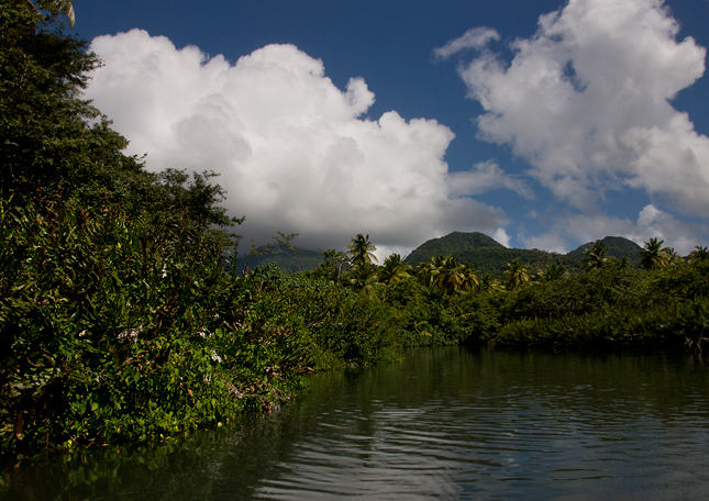 V horním toku řeky, těsně před tím, než se zcela vnoříme do přítmí zelené džungle, připlouváme na otevřenou lagunu, kterou krásně nasvětluje slunce.