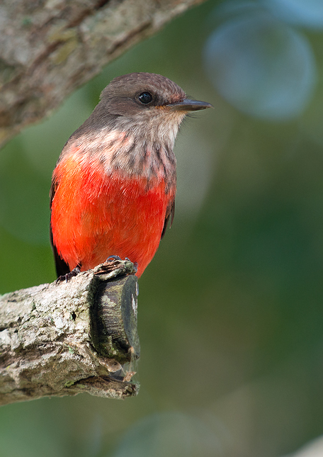Poddruh: Pyrocephalus rubinus saturatus, samička. Samička tohoto tyranovce se poměrně dost lišila od samečka (je rovněž v této fotogalerii). To, že se oba dost trvrdošíně drželi u jediného stromu, jejich poměr provalilo.