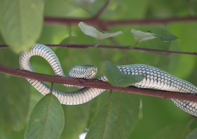 Tento had nemá české jméno. Je z čeledi zmijovitých. Má typickou trojúhelníkovitou hlavu a dle průvodce se může vyskytovat v mnoha barevných variántách. Typický je zlutý proužek ve spodní části hlavy. My jsme ho "objevili" po prvním večerním nevydařeném výjezdu. Byl na stromě hned před vstupem do restaurace ve výšce asi čtyř nebo pěti metrů. Celý rozradostnělý, že můžu neco fotit jsem začal obcházet strom a hledat ten nejlepší úhel. Byla ale už tma a bez ohledu na úhel záběru forky nestály za nic. Průvodce mě utěšil, že had je na stejném místě už měsíc a do určitě tam vydrží i do dalšího dne. Vydržel. Pokaždé když jsme pak vcházeli do restaurace jsem ho neopomněl pozdravit a zkontrolovat, zda se náhodou nepřemístnil pod náš stůl.