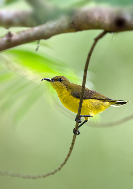 Samička, poddruh: Aethopyga siparaja siparaja. Vlastně ve všech ubytovacích zařízeních přilétali na kvetoucí stromy ptáci, zejména strdimilové, aby si zobli nektaru a my jsme v rámci poledního klidu je zkoušeli fotit. V Kinabatangan Riverside Lodge v Sukau byly naše polední úlovky nejbohatší.
