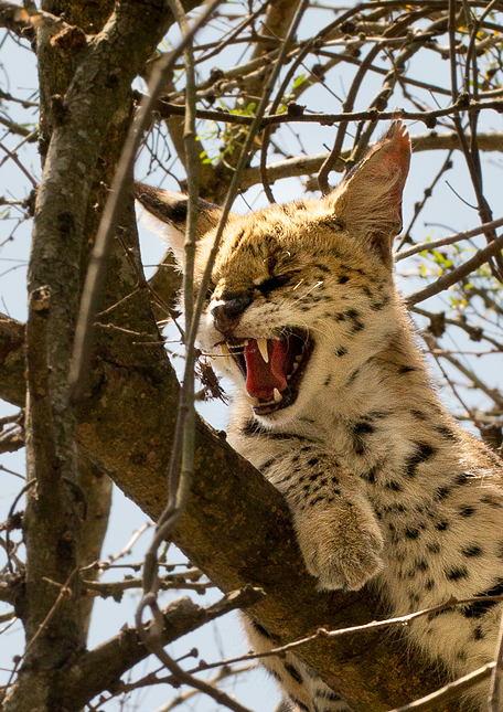 Na tomto obrázku se snažil serval vypadat hrozivě, ale dole na zemi byl přítulný jak domácí kočka a nechal se bez odporu pohladit.