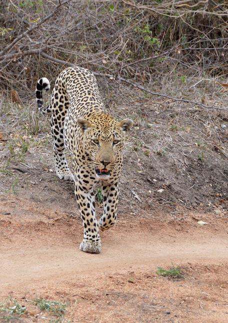Tady leopard vychází z buše a volným krokem míří k našemu autu.