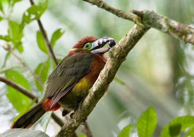 Samička. Arassari skvrnozobý je jedním z 6 druhů rodu Selenidera, které žijí v severní části Jižní Ameriky. Zbarvení samičky se výrazně liší od zbarvení samečka. Tuto samičku arassariho jsme zastihli zřejmě na snídani, kdy se doslova cpala černými bobulemi a celkem ochotně nám pózovala.
