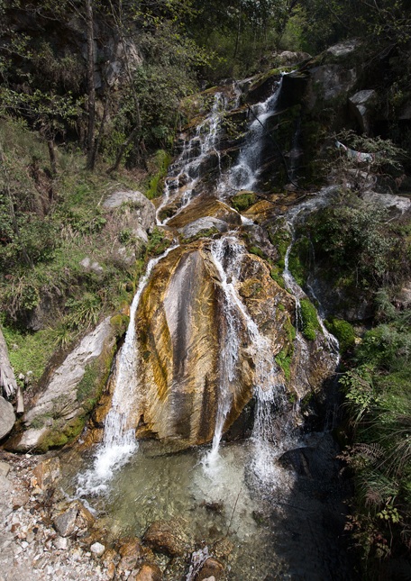 Za průsmykem Pele (Pele La = 3420 m n.m.) znovu odbočujeme z východního směru na jih podél Černých hor (Black Mountains) k jednomu z bhútánských "ptačích rájů". Cestou míjíme vodopády, které se valí z příkrých svahů na úzkou silnici. Sluníčko dopoledne příjemně svítí a nic nenasvědčuje změně počasí.