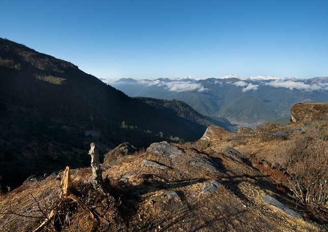 Hned druhý den jsme vyrazili z Para do průsmyku Chele, ze kterého se otevírá krásný výhled nejen do údolí Haa. Obrázek je asi z osmé hodiny ranní, kdy se rozplynul všudypřítomný opar. Průsmyk Chele (Chele La) ležící v nadmořské výšce 3988 m je nejvyšším bodem, kam se v Bhútánu můžete dostat autem.