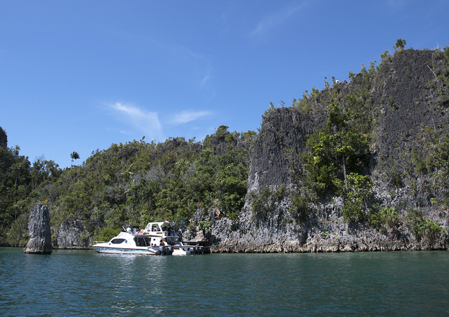 Po návratu z vyhlídky jsme ještě pomalu proplouvali mezi ostrůvky uvnitř zátoky, aby se nám krajina dostala co nejvíc pod kůži. Dvě lodě na obrázku zde kotvily u další vyhlídky, na kterou jsme však už nelezli. Čekala nás více jak dvouhodinová cesta zpět na ostrov Kri.