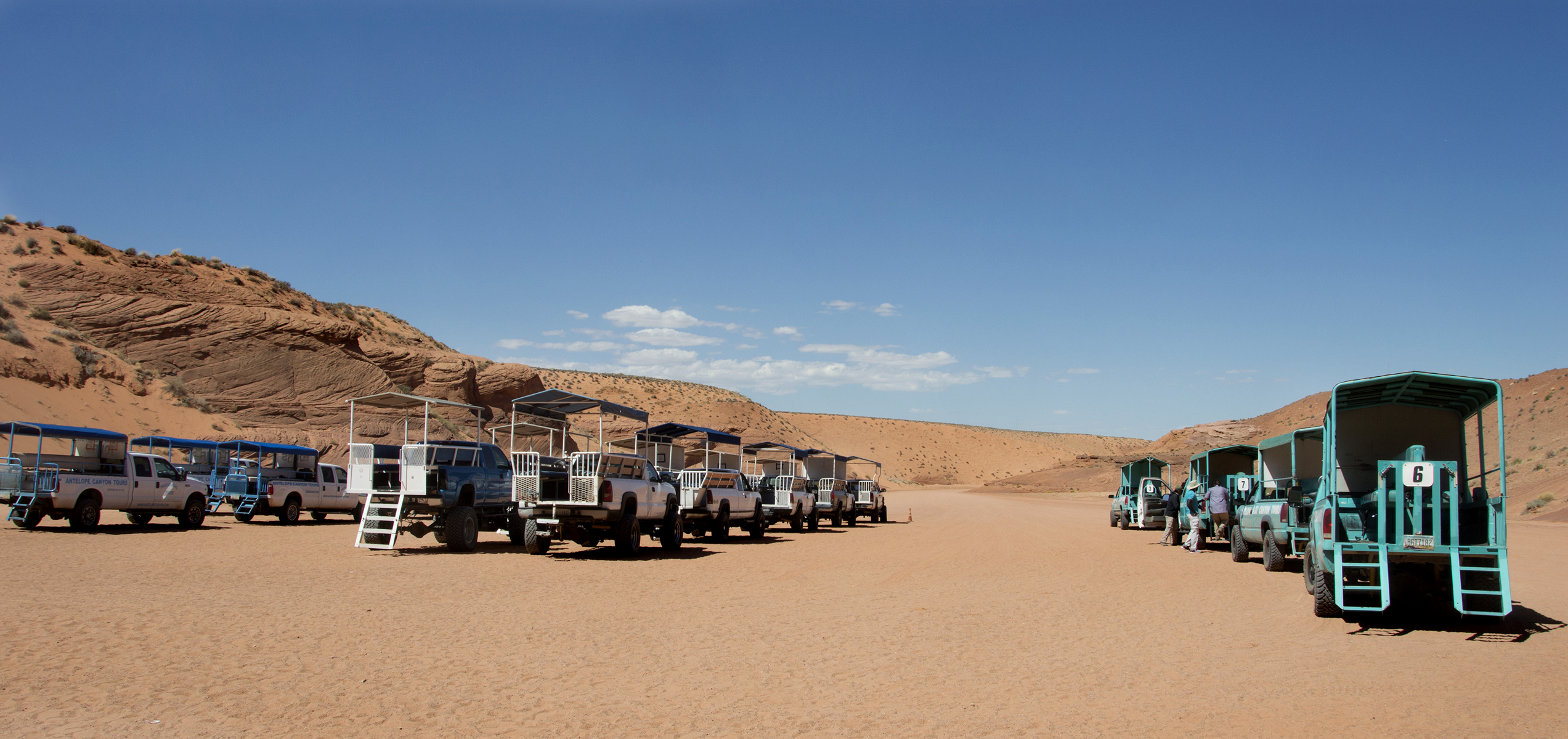 Antelope Canyon je podle mého názoru poměrně velký business. Vstupné, zvlášť pro fotovýpravy, je dost vysoké a počet návštěvníků na nevelký 200 m dlouhý kaňon skutečně vysoký (viz zaparkovaná auta).