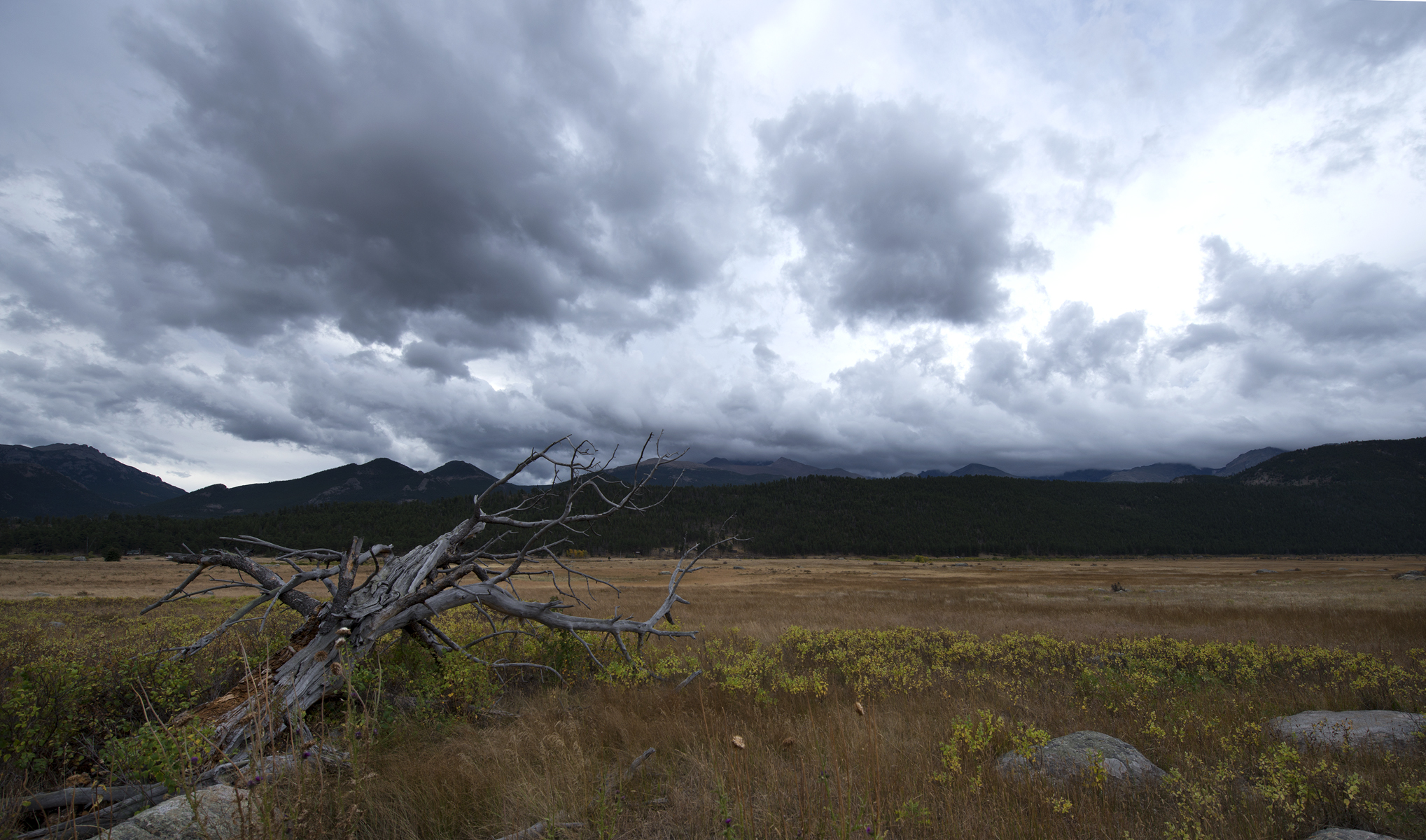Druhý den ráno nás Skalisté hory přivítaly černými mraky.