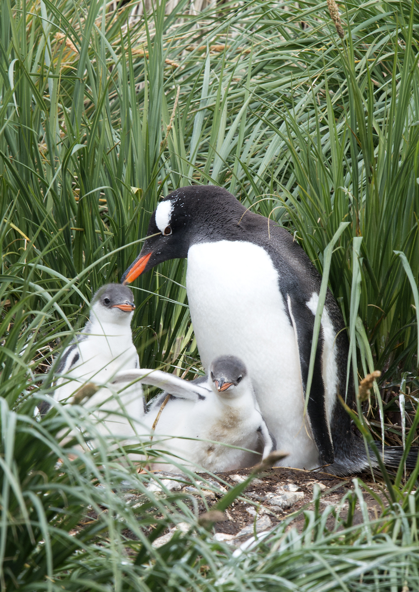 Tučňáci oslí byli na Prionu kryti vysokou trávou, takže jsme je viděli jen nahodile. Tento rodič se dvěma mláďaty nám zapózoval kousek od dřevěného chodníku.