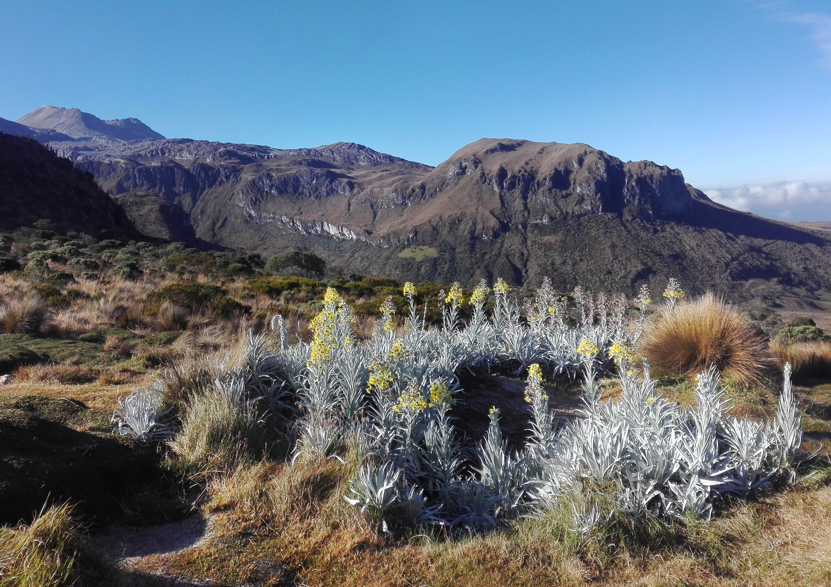 Ranní vyhlídka na paramo v Los Nevados. V popředí jsou klejovky (Espeletia sp.) se stříbřitými chlupatými listy a drobnými květy.