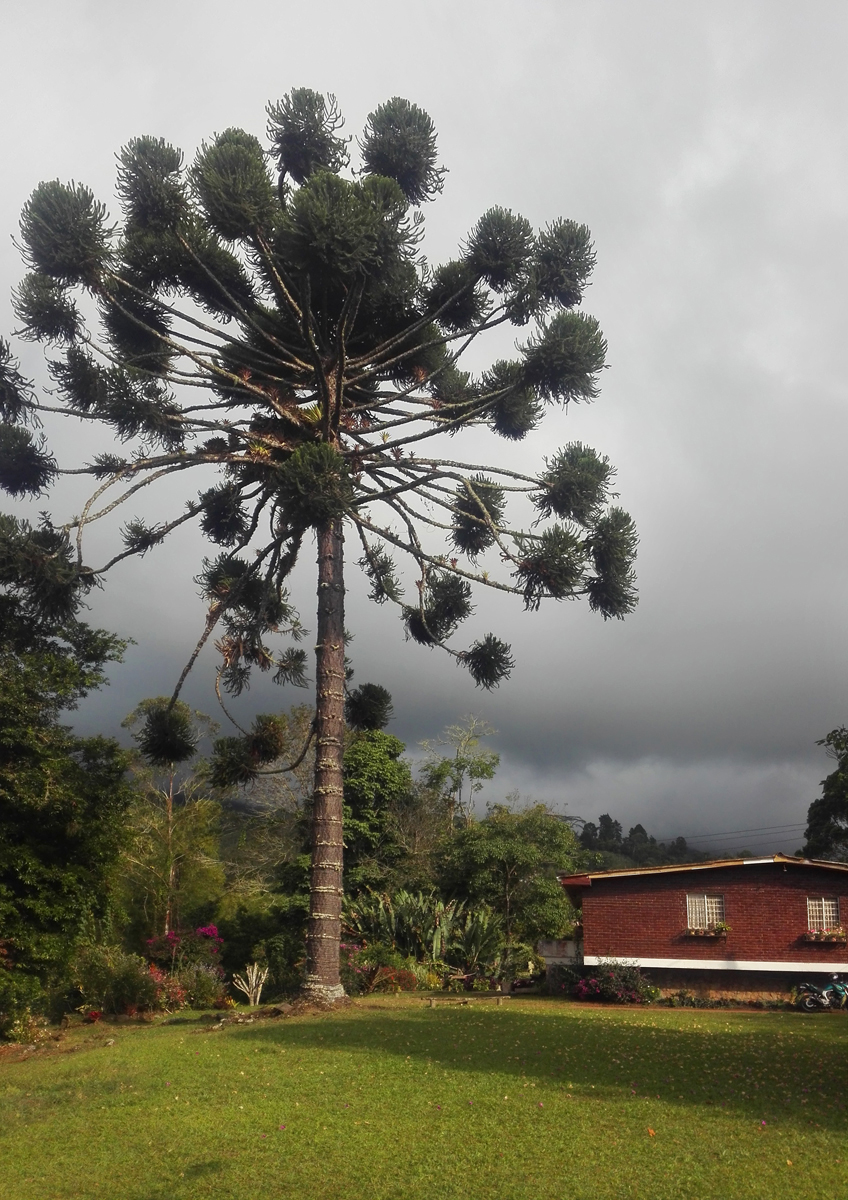 Zahrada Araucana Lodge se může pochlubit několika velice zajímavými botanickými exempláři. Určitě mezi ně patří i tento obrovský jehličnan. Pravděpodobně Araucaria sp.