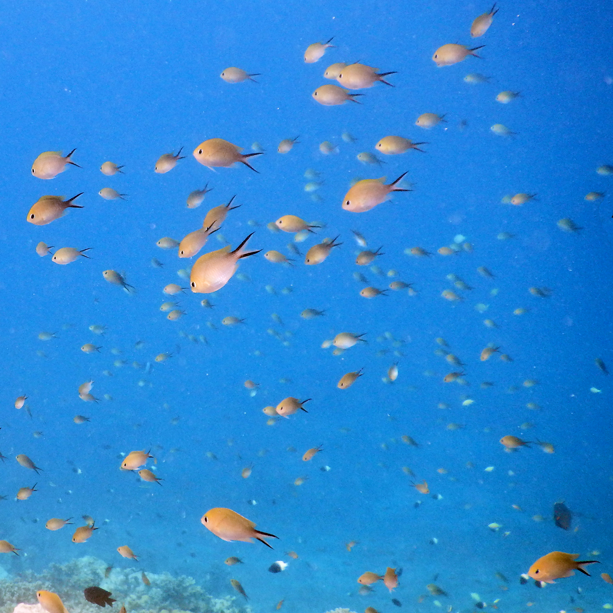Asi největší hejna co jsme u ostrova viděli patřila sapínu trojitému. Jejich drobná tělíčka vyplňovala obrovské prostory od krany útesu až daleho nad hluboké vody.