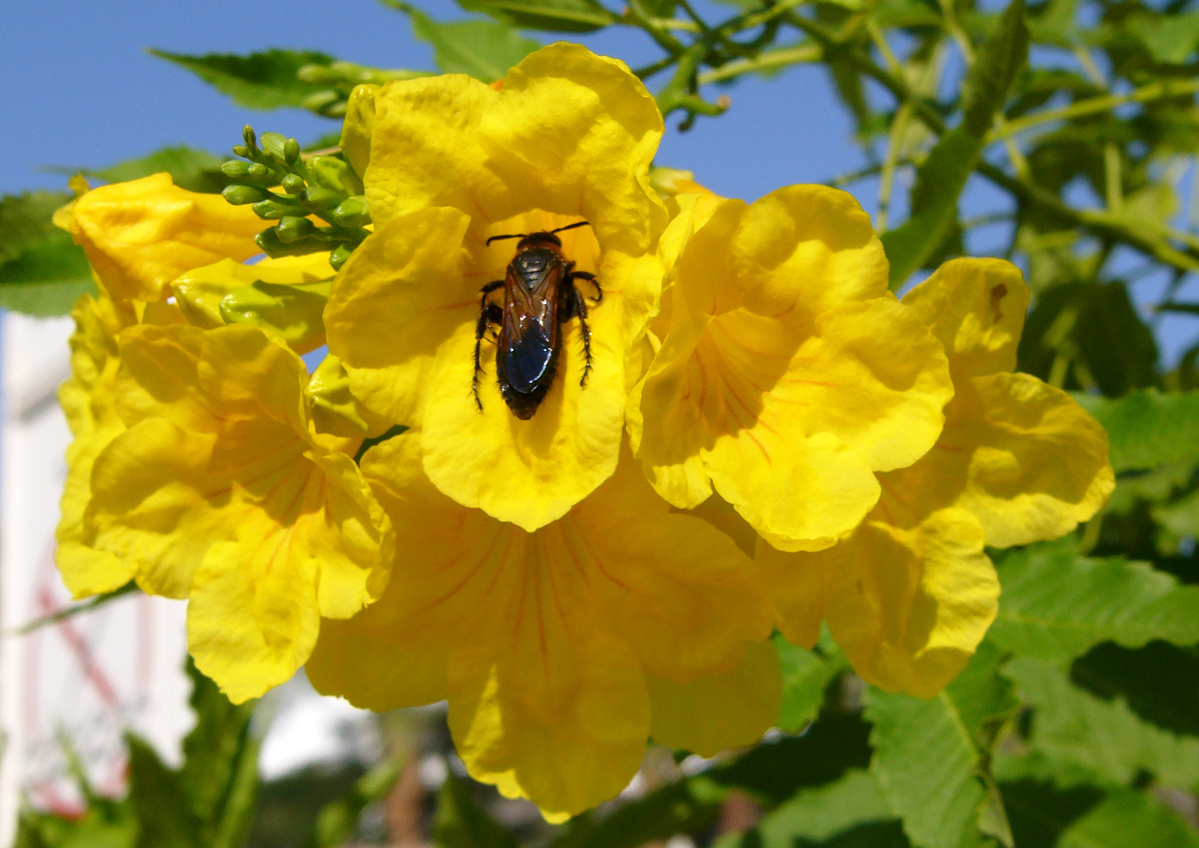 Tyto žluté květy trubače byly jedny z mnoha co zdobily hotelovou zahradu.