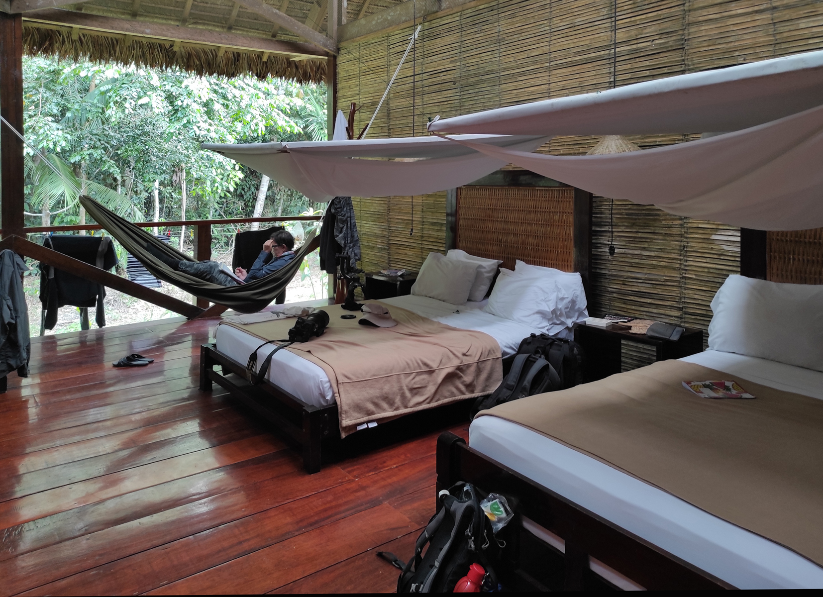 V polední pouze vypadal náš pokoj asi takto. Že nevidíte nikde okna nebo dveře? Díváte se dobře nejsou zde ani v poledne ani večer ani ráno. Náš pokoj to vlastně bylo taková zastřešená terasa propojená s džunglí. V noci nás ještě oddělovala od džungle moskitiéra. První noc jste z toho trochu nejistí, ale třetí a čtvrtá noc už je v pohodě.