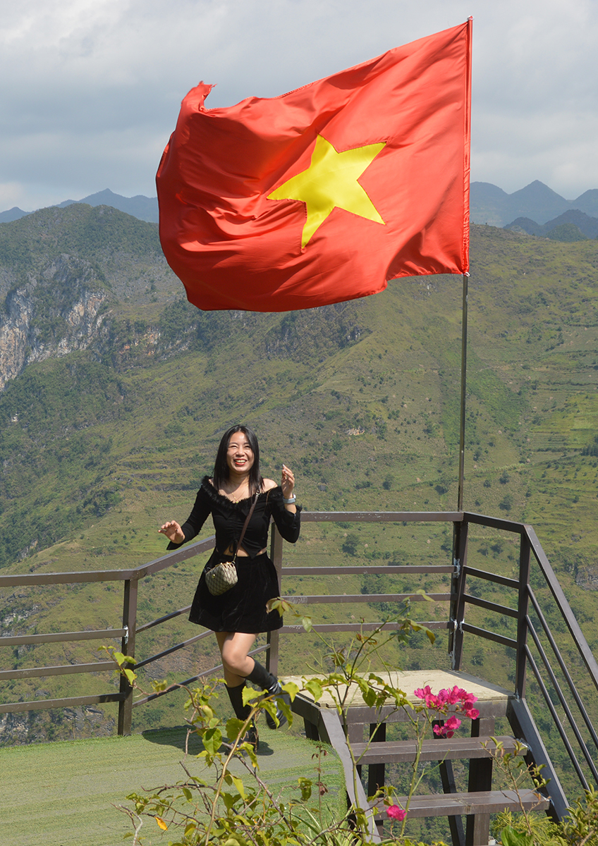 Vyhlídka na průsmyk Mã Pí Lèng nabízí i rafinovanější focení krajiny v kombinaci s vietnamskou vlajkou. Během našeho asi 10 minutového pobytu na této vyhlídce bylo pod praporem neustále plno.