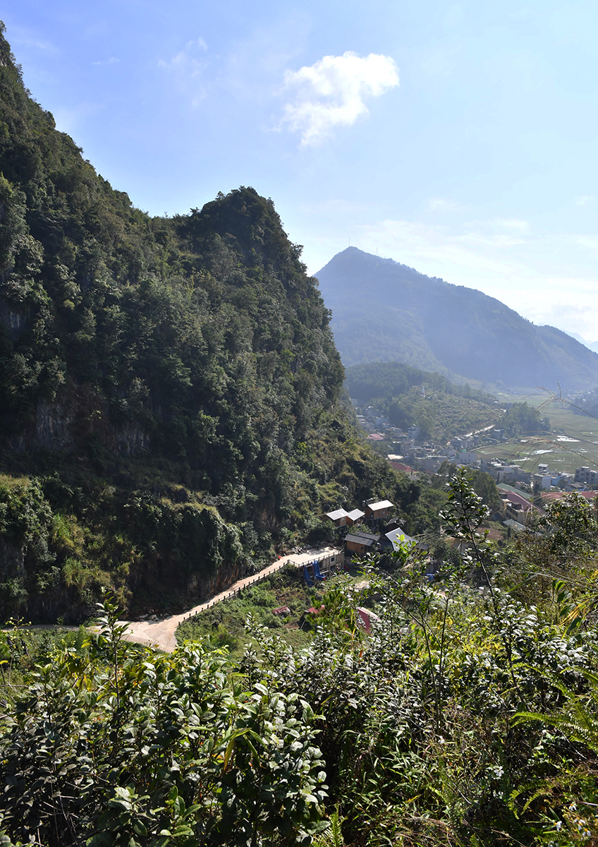 Předchozí den jsme dorazili do městečka Dong Van až za tmy a tak se následující ráno kocháme pohledy na krasové okolí městečka. Spali jsme v hotýlku Dong Van Cliffside House přimáčknutém ke skalní stěně. Teď šlapeme nedlouhý, ale dost strmý výstup k francouzské pevnosti nad městem a objektiv jsme zaměřili právě na jmenovaný hotel.