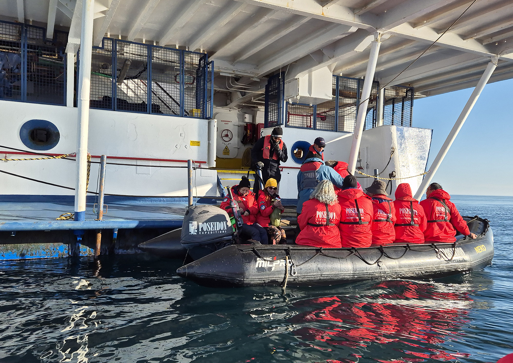 Plavba v zodiaku byla pro nás každodenní rutina. Hned na začátku jsme byli rozděleni do čtyř skupin podle jazykovů: angličtina, němčina, čínština a hebrejština ( jinak skupina A,B,C a D). V každé další lokalitě se cyklicky měnilo pořadí nástupu do zodiaků takže si nikdo nemohl stěžovat, že je odstrkován. Před nástupem do zodiaku jsme se (už v záchranných vestách) pěkně seřadili na 3. palubě. K zodiakům jsme pak sestupovali na zadní plošinu na 2. palubě ve skupinkách po deseti. Při nástupu do zodiaku nás vždycky jistili dva členové posádky.