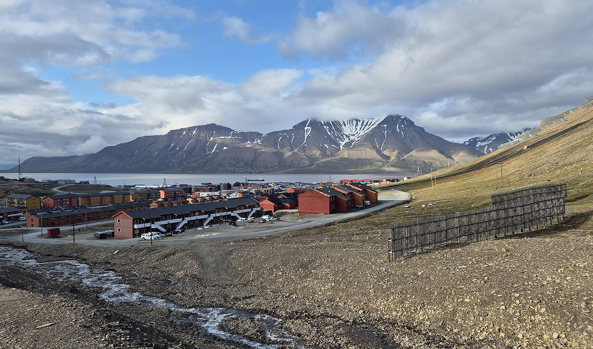 Obytná čtvrť Longyearbyenu a za ní Lonyearbyenský záliv a panoráma dotvářejí hory. Téměř uprostřed jsou dva nejvyšší zdejší vrcholy: Adventtoppen a Hjorthbreen.