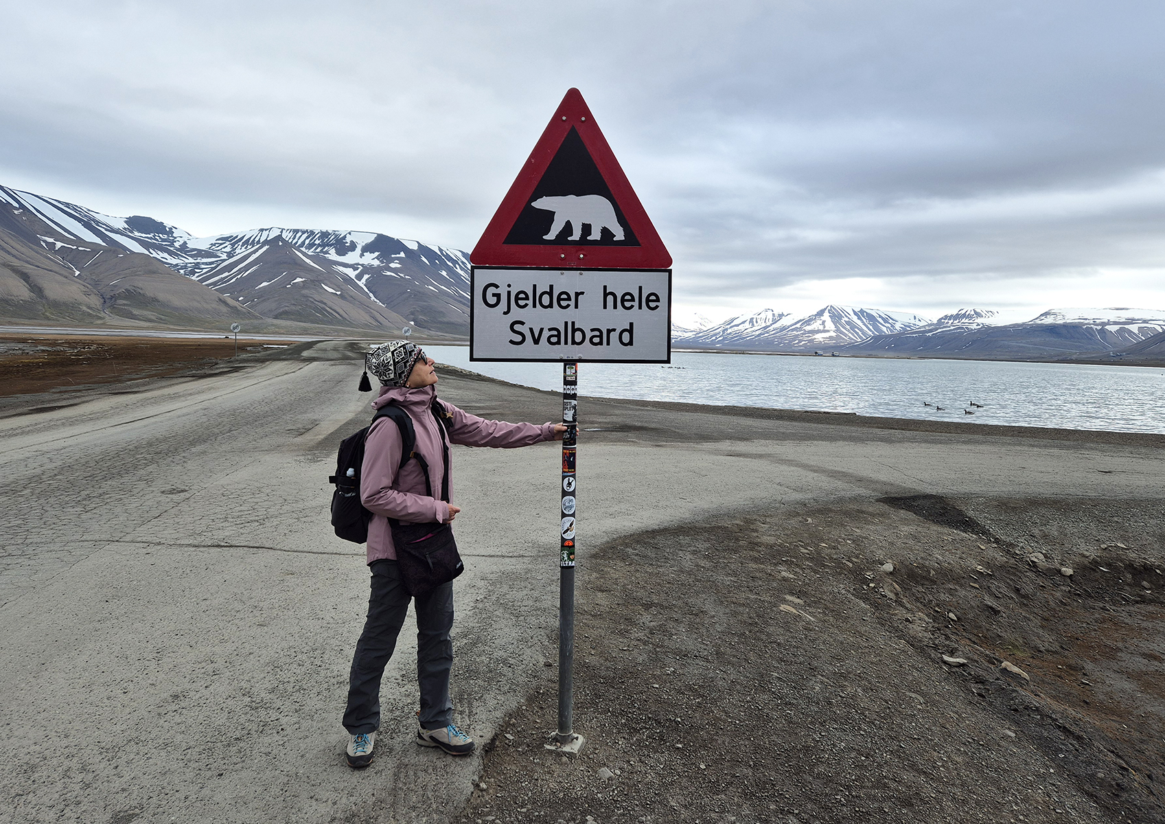 Pěší asi dvoukilometrovou vycházka z Longyearbyenu podél zálivu k přehradě Isdammen (ve spodní části údolí Adventdalen) končí u této značky. Pokud nemáte pušku nebo ozbrojený doprovod dál jít nemůžete (nebo byste neměli). Zdejší medvědi nejsou domácí mazlíčci.