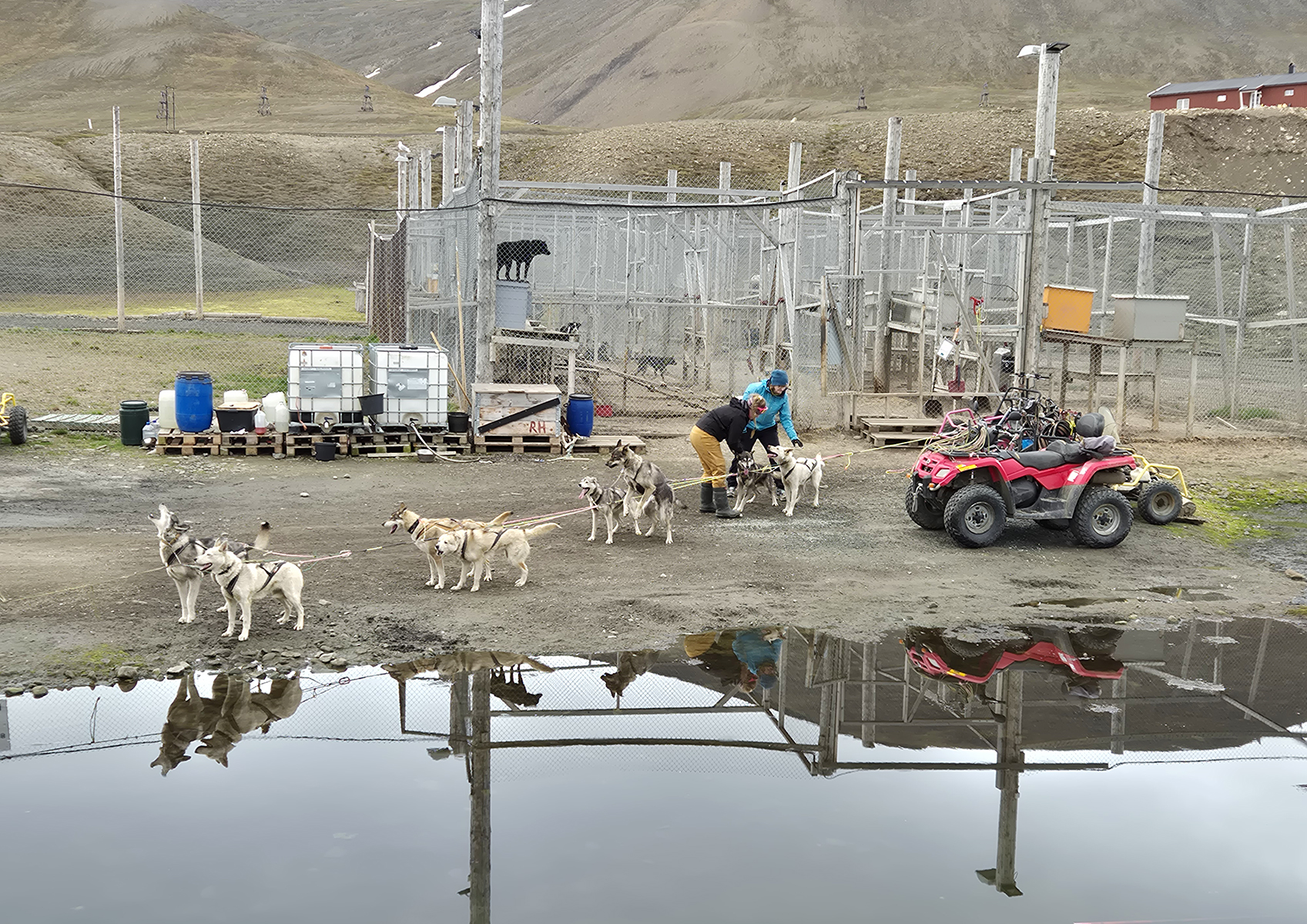 U cesty z Longyearbyenu do údolí Adventdalen jsme míjeli psí stanici. Dvě musherky právě připravovali psí spřežení "na suchou jízdu".