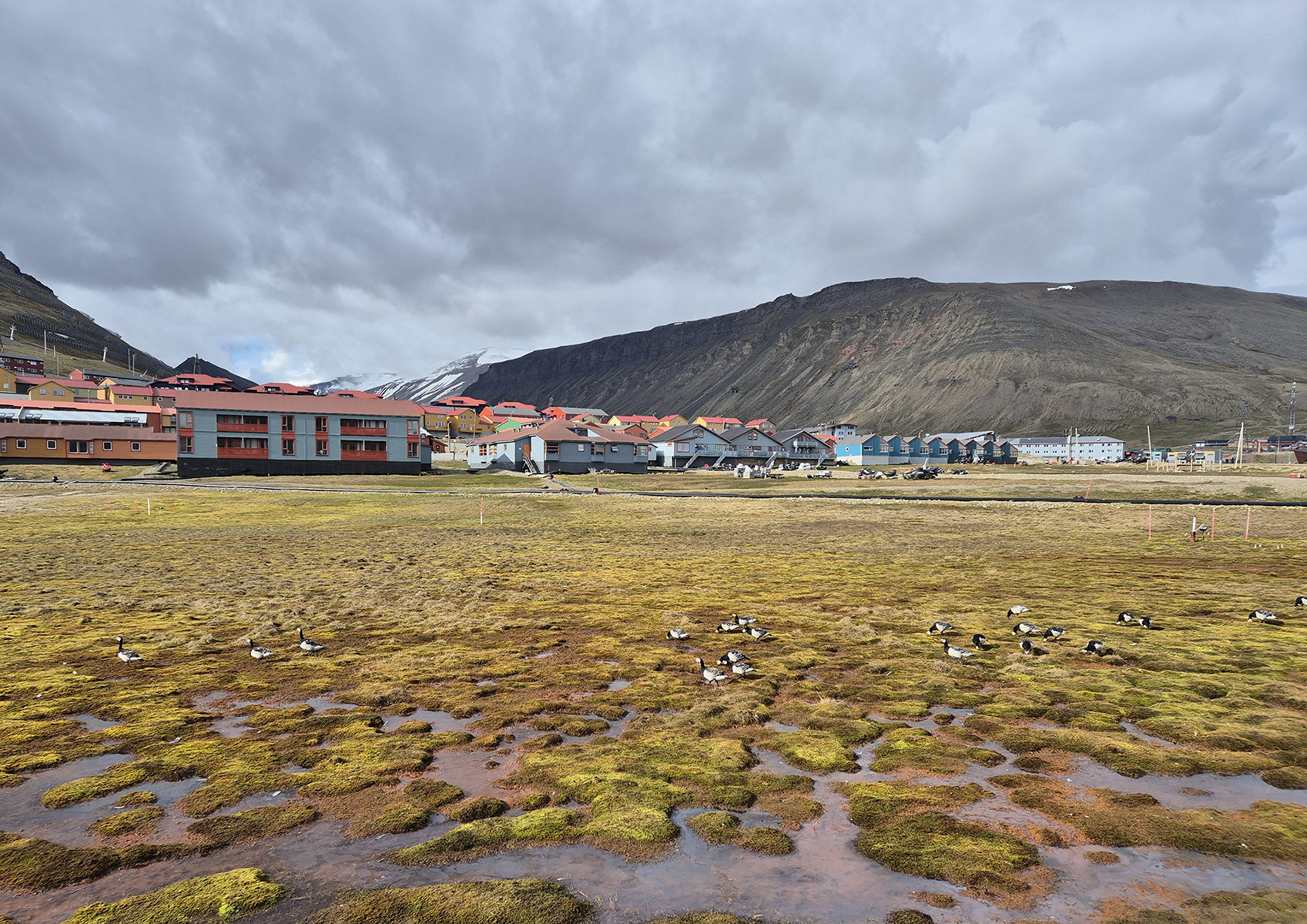 Mezi silnicí k Adventdalen a zástavbou Longyearbyenu byly louky s malými jezírky. Ideální místo pro bernešky.