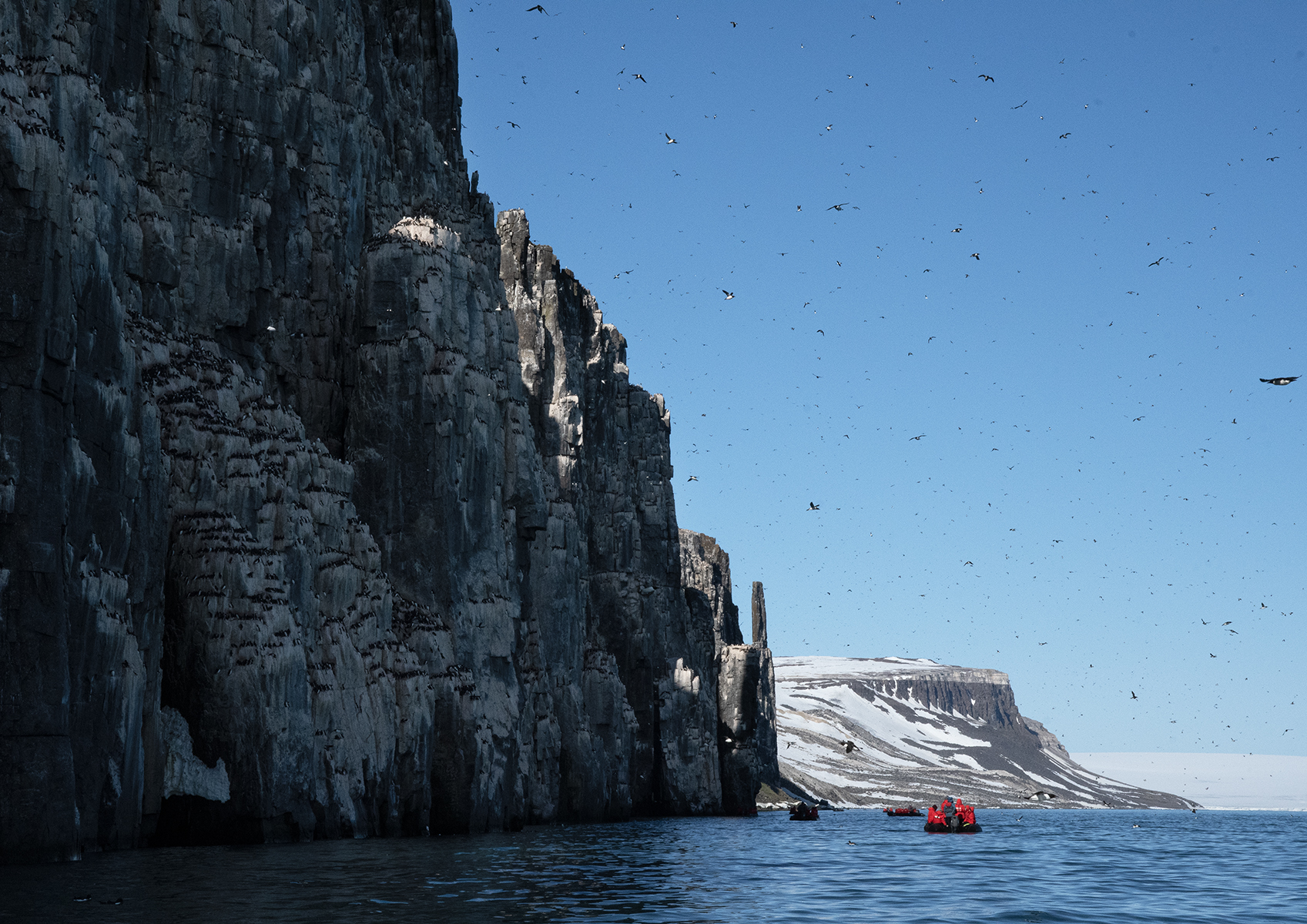 Alkouni tlustozobí (Uria lomvia) na obloze u Alkefjelletu