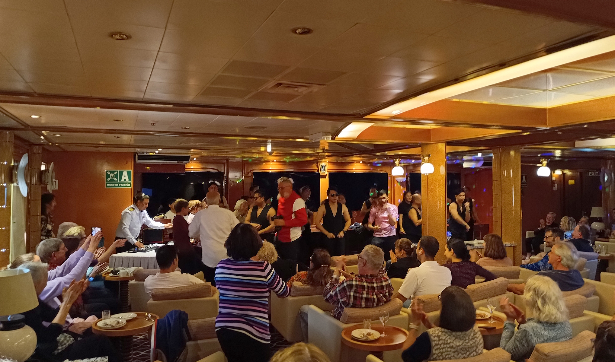 14. července je pro nás připravena v přednáškovém sále "Šou" jeět k tomu čokoládová. Každý příchozí dostaně jako nášup k večeři ještě několik čokoládových zákustků. To ale není hlavní číslo večerního programu, hlavním číslem je taneční a pěvecké vystoupení členů posádky Sea Spirit. Hlavně zpěváci mi připadají dost dobří a tanečníků se zase podaří roztančit skoro všechny přítomné. Myslím si, že s ohledem na to jaký byl náš věkový průměr jsme se rozšoupli docela pěkně.