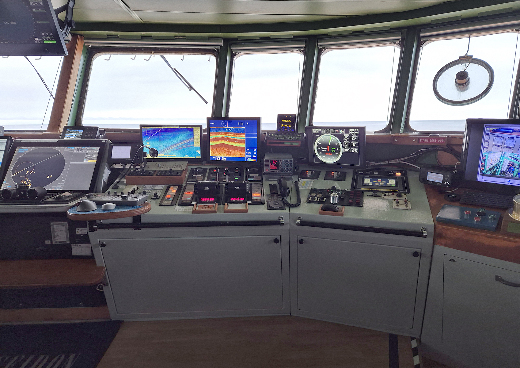 Pokud to počasí a charakter plavby dovoloval mohli jsme navštívit kapitánský můstek a podívat se jak vypadá činnost kapitána nebo jeho zástupců. Většinou to vypadalo dost jednoduše, kapitán stál před centrálním panelem koukal a nic neříkal. Přístroje ukazovali nejrůznější čísla a obrázky, pravděpodobně rychlost lodi, směr plavby, klimatické podmínky, hloubku, atd.