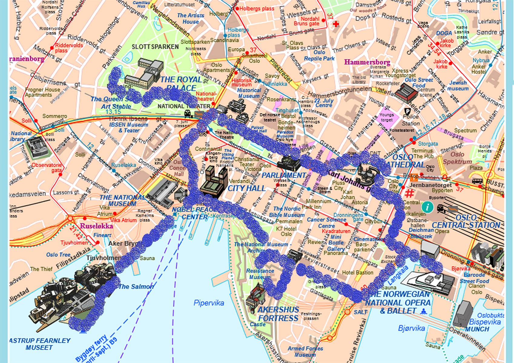 Naší poznávací trasu jsme zvolili podle několika doporučení, které jsme našli na webu. Začínali a končili jsme na centrálním nádraží, které má relativně rychlé spojení s letištěm. Odtud jsme pokračovali kolem zdejší katedrály a po hlavní třídě (Carla Johans Gase) až ke královskému zámku. Pak jsme se obrátili k jihu na nábřeží Waterfront. Dále cesta pokračovala k východu podél moře k pevnosti Akershus. Na závěr jsme se pokochali moderními budovami místní opery a muzea nejslavnějšího norského malíře Muncha. Odtud už byl jen skok zpátky k centrálnímu nádraží.