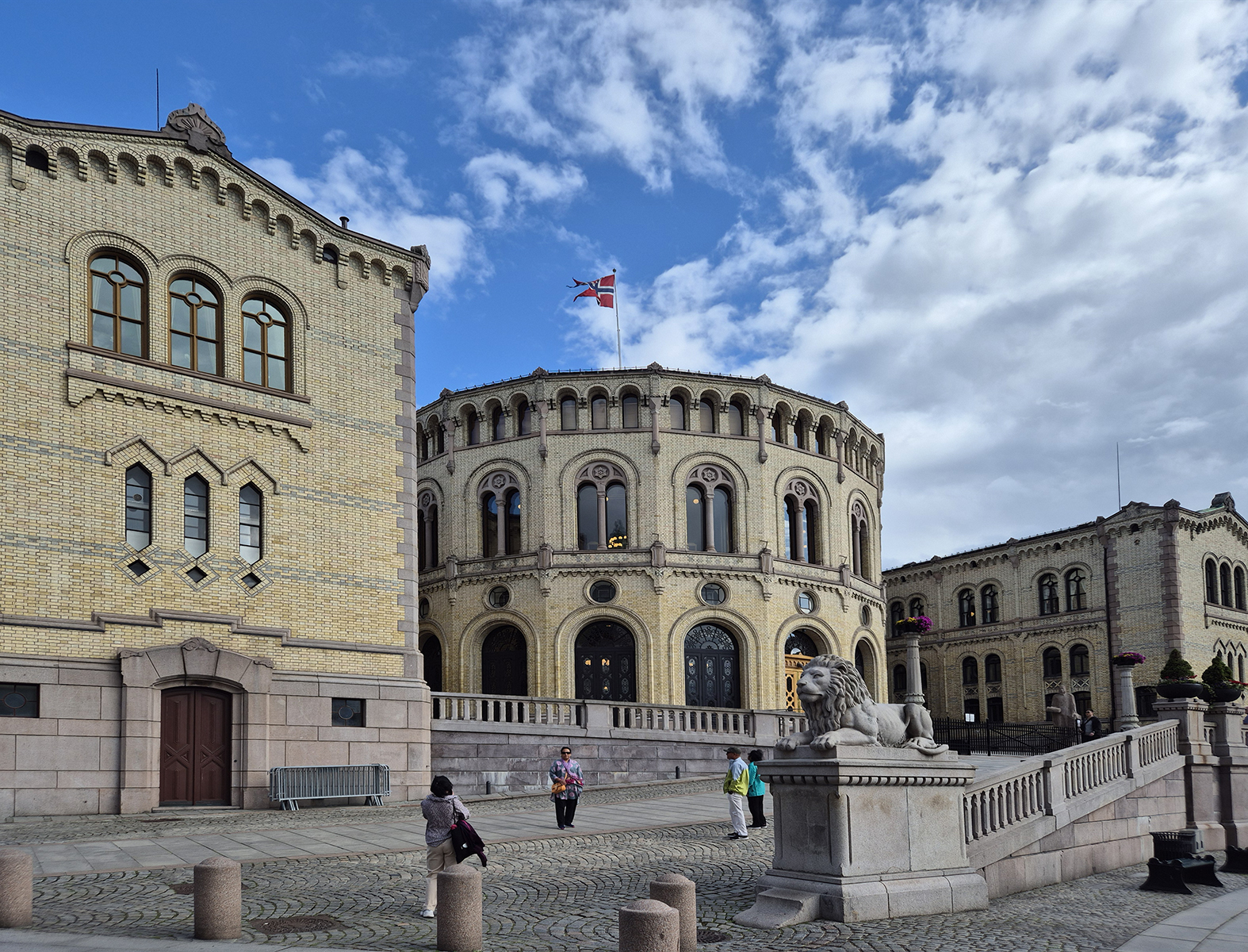Budova z 19. století stojí na levé straně třídy Carl Johans Gate. Čelní strana budovy je orientována směrem ke královskému paláci. Začíná zde park (Stortingsparken) vyzdobený četnými fontánami, sochami a samozřejmě květinami.
