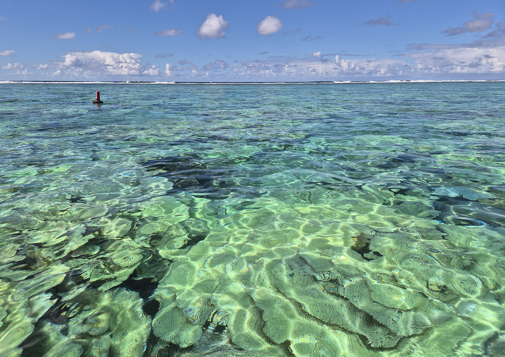 Moře v zátoce Blue Bay je průzračné a trsy korálů se téměř dotýkají mořské hladiny.