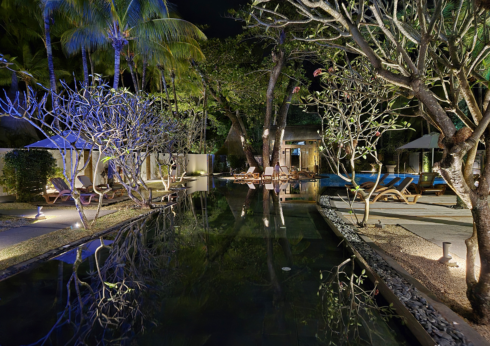 Součástí hotelového komplexu byla i masážní a relaxační zóna se zahradou, která večer hýřila barvami.