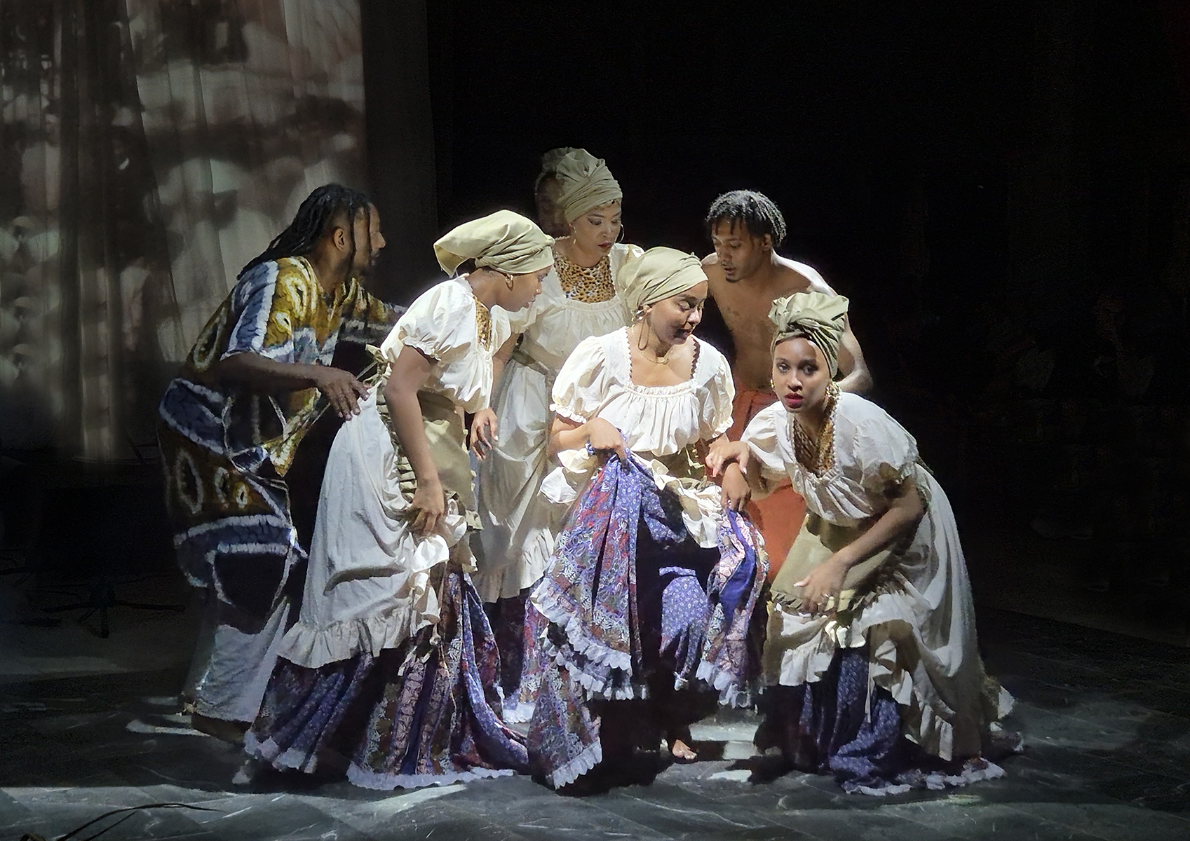 Každý večer nabídla hotelová scéna dvě kulturní akce. První akcí bylo vždy hudební vystoupení zpěváka nebo hudební skupiny. Druhá akce začínající po deváté hodině byla poměrně pestrou mozajkou kulturních produkcí. Nás nejvíc zaujalo epické taneční vystoupení, které čerpalo svůj děj z dějin Mauriciu. Z tohoto představení je i tato fotografie.