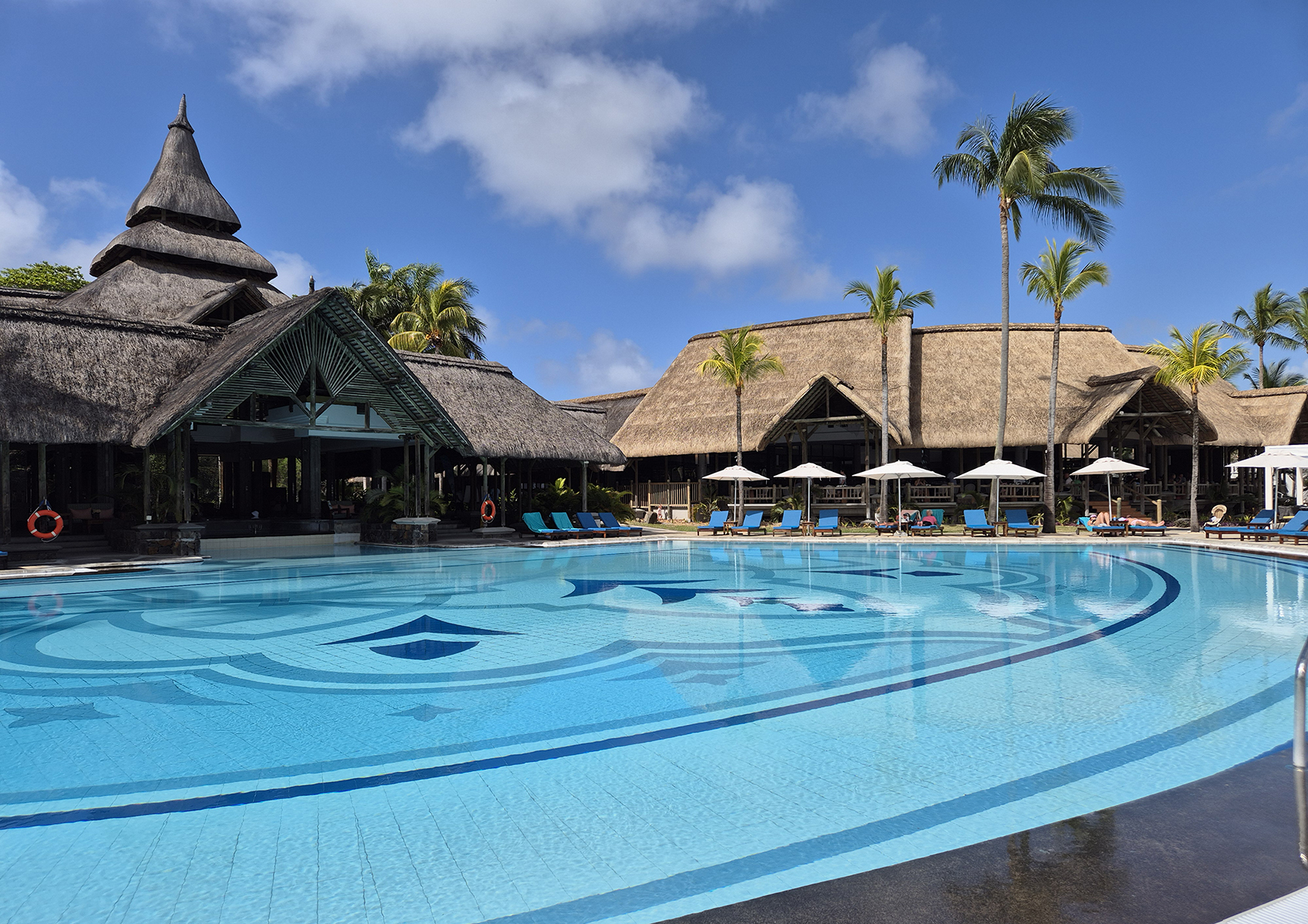 Hotel Shandrani Beachcomber je velice přjemný čtyřhvězdičkový hotel na jihovýchodním pobřeží Mauriciu přímo u mořské rezervace Blue Bay. Budovy hotelu a velká zahrada se sportovními kurty a golfovým hřištěm zabírá celý poloostrov, který z jižní strany ohraničuje zátoku Blue Bay. Kromě výborného šnorchlování přímo z východní pláže nabízí hotel řadu vodních i "nevodních" sportovních aktivit. Na fotografii je hlavní budova hotelu, kde je vstupní hala, recepce a vpravo velká bufetová restaurace. V popředí je větší ze dvou hotelových bazénů.
