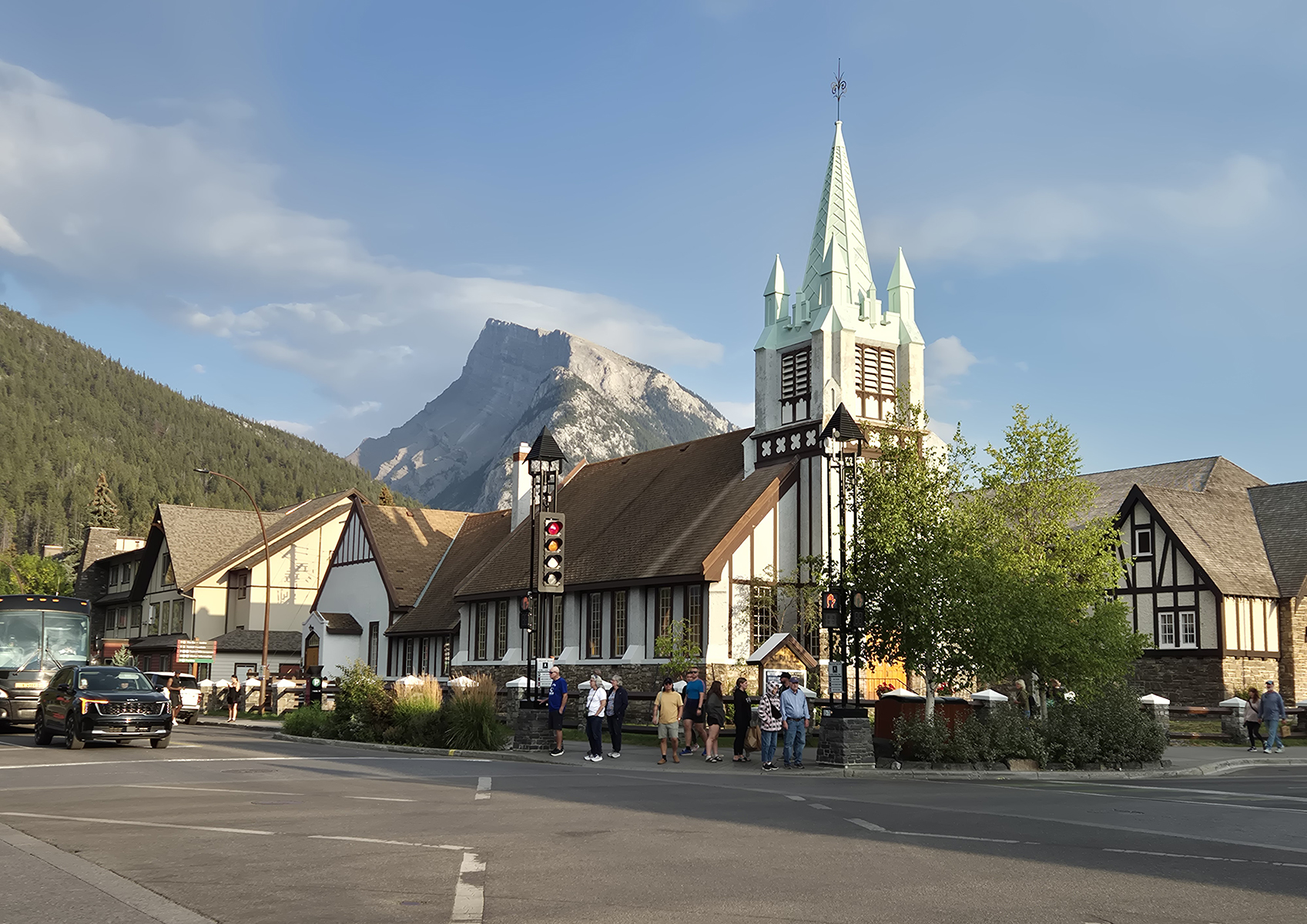 Po návratu od jezera Minnewanka jsme si zašli na večeři do středu města Banff. Po večeři jsme se pak po Banff Avenue vraceli zpět do hotelu. Na snímku je presbyteriánský kostel a za ním Cascade Mountain.