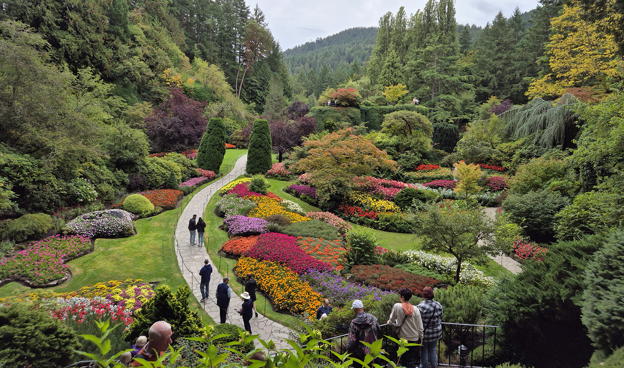 Při plánování návštěvy Butchart Gardens na konec září jsme byli tak trochu smíření s tím, že hlavní sezónu květů tady určitě nezastihnem. Skutečnost byla ale úžasná. Tento snímek snad nejlépe zachycuje jaké barevné kreace mohou vykouzlit zářiové květy společně s podzimními listy na stromech.Tato část zahrady se nazývá Sunken Garden (ponořená zahrada).