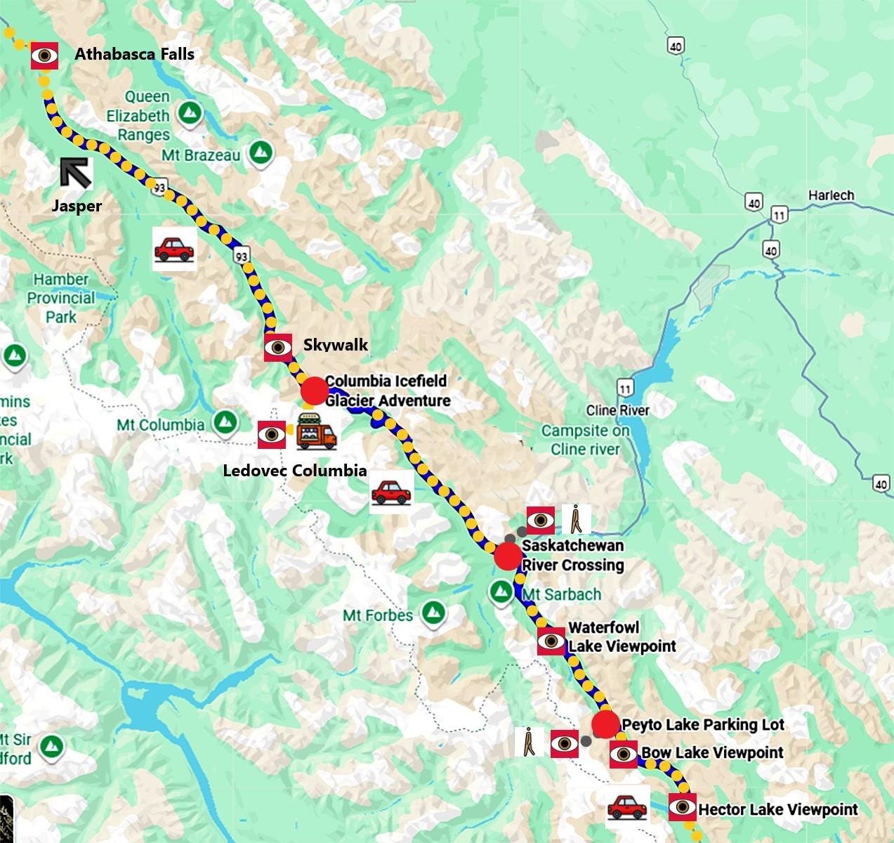 Mapka našich zastávek na Icefield Parkway