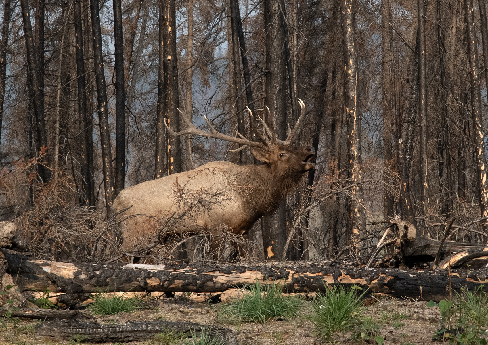 První den, který jsme trávili poznáváním okolí Jasperu, jsme dopoledne vyjeli k jezeru Beauvert. Hned za odbočkou na vedlejší silnici, která vedla k jezeru, se ve vyhořelém lese páslo stádo jelenů wapiti. Tento druh mohutných kopytníků byl dříve považován za poddruh jelena lesního, dnes je však jednoznačně ddefinován jako samostatný druh. V kohoutku měří až 150 cm a váží přes 300 kg.